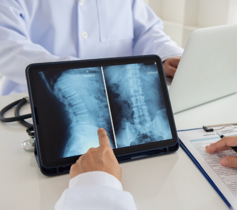 To determine if myeloma cells have caused any bone damage, X-rays are taken of the head, spine, ribs, hips, legs, and arms.